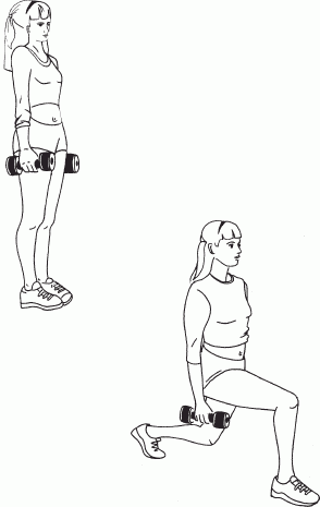 Возьмите в руки по гантеле и встаньте прямо. Напрягите мышцы пресса, подбородок слегка приподнят. Выполните выпад правой ногой и опуститесь в присед. Силой правой ноги поднимитесь из приседа. Перенесите вес тела на правую ногу, выпрямитесь и приставьте к ней левую. Затем шагните вперед левой ногой и, продолжая чередовать ноги, выполните выпады, продвигаясь вперед. Внимание! Сохраняйте идеально прямое положение туловища.