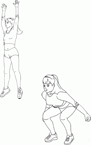 Встаньте прямо, стопы на ширине плеч, колени слегка согнуты. Присядьте и отведите руки назад, как пловцы перед стартом. Взгляд направьте прямо перед собой. Мощным усилием выпрыгните вверх, помогая себе руками (как показано на рисунке). Сразу же после приземления опуститесь в присед.