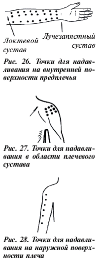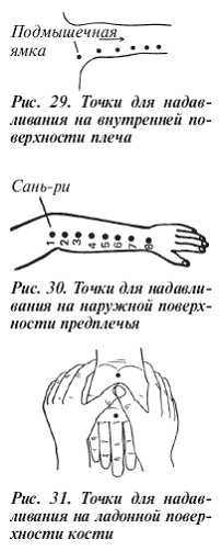 Если устали мышцы рук. С утомлением рук надо бороться при раннем его проявлении, так как оно может стать причиной сильной боли. Пианисты, программисты, телеграфисты, кассиры, бухгалтеры или секретари получают быстрое облегчение при болезненности в руках, воздействуя методом шиацу на точки, изображенные на рис. 26–31.