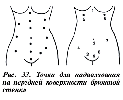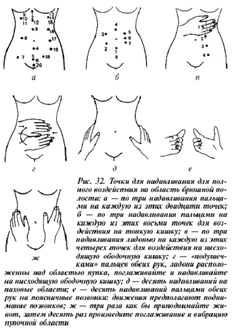 Уложив пациента на спину, сядьте справа и проводите осторожные поглаживания живота в надчревной области ладонью в течение пяти секунд. Повторите поглаживание пять раз. На рис. 32 показаны точки для надавливания и порядок, в котором на них следует воздействовать.