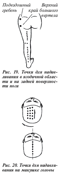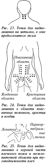 Вначале пациента может беспокоить боль, затем она постепенно проходит. После надавливания на эту точку пять или шесть раз надавливайте примерно по три секунды на каждую из девяти точек, расположенных слева вдоль позвоночного столба сверху вниз. Точки должны отстоять друг от друга примерно на 25 мм. Повторите надавливание три раза. Затем проведите такое же воздействие на точки с правой стороны.