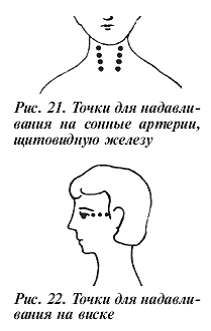 Как избавиться от утреннего недомогания. Думаю, что многим знакомо состояние, когда по утрам отмечается тяжесть в голове, недомогание, плохое настроение, несдержанность. Причиной является застой венозной крови в области головы. Проблему можно легко устранить, стимулируя приток крови с помощью шиацу. Надавите на область макушки (рис. 20) – голова слегка прояснится. Затем «подушечкой» большого пальца слегка надавите сначала на правую сонную артерию, затем на левую по нескольку раз (рис. 21). Надавливание начинайте от нижней челюсти, постепенно спускаясь к ключице. Воздействие на эти точки способствует расширению кровеносных сосудов, притоку к мозгу свежей крови и, следовательно, улучшению самочувствия.