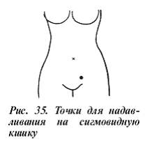 Кал имеет тенденцию застаиваться в сигмовидной кишке, расположенной слева по диагонали вниз от пупка (рис. 35). У человека, страдающего хроническим запором, в этом месте обнаруживается уплотнение. Используя трехпальцевую методику (рис. 4), растирающими движениями обеих рук воздействуйте на эту область примерно в течение трех минут (рис. 35). После начавшейся перистальтики в кишке ощущается позыв к дефекации. Затем следует выпить стакан слегка подсоленной воды. При такой ежедневной утренней процедуре функция сигмовидной кишки должна нормализоваться.