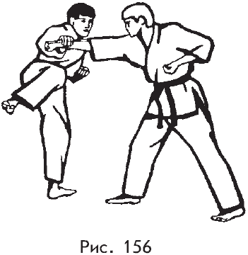 в) захват бьющей руки атакующего своей правой рукой с одновременной контратакой круговым ударом правой ноги по корпусу (рис. 156, 157).