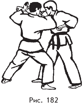 в) не меняя положения ног, контратака ударом снизу-вверх локтем правой руки по корпусу (рис. 182).