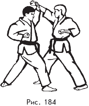 б) при атаке правой рукой в голову защищающийся выходит правой ногой вперед с одновременной защитой левой рукой (рис. 184);