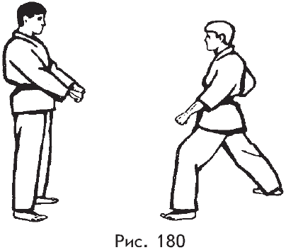 б) при атаке правой рукой в голову защищающийся выходит правой ногой вперед с одновременной защитой левой рукой (рис. 181);