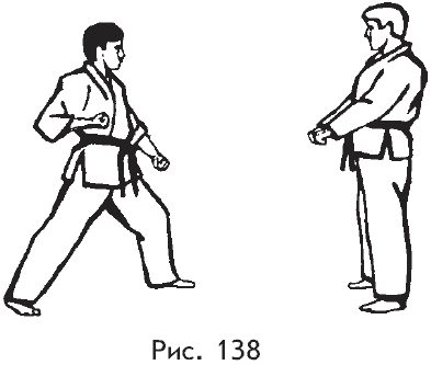 в) с захватом бьющей руки и шагом левой ногой вперед-влево контратака ударами правой рукой в голову и корпус атакующего (рис. 135, 136, 137).