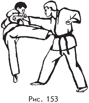 в) контратака ребром стопы правой ноги с одновременным захватом бьющей руки атакующего своей правой рукой (рис. 153).