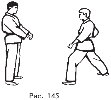 б) при атаке правой рукой в голову защищающийся уходит левой ногой вперед, параллельно движению атакующего с одновременной защитой левой рукой (рис. 146);