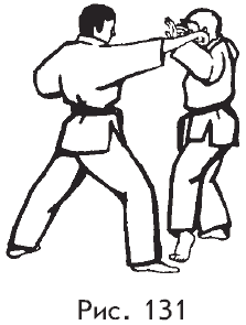 в) с захватом бьющей руки и шагом левой ногой вперед-влево контратака ударом ребром ладони правой руки сверху (рис. 132).