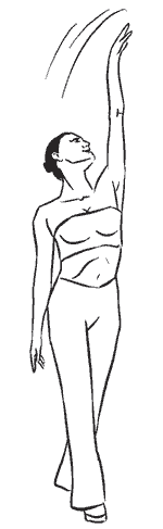 Соедините ноги вместе, поднимитесь на носочки и потянитесь корпусом за рукой вверх. Поменяйте положение рук и ног и повторите движение.