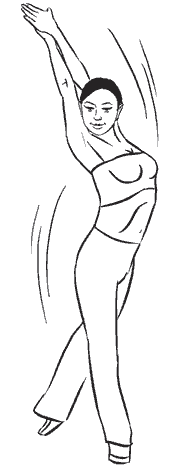 Стоя на месте, заведите левую ногу назад и поставьте на носок, плавно поднимите руки вверх, расположив ладони друг напртив друга. Корпус напоминает изогнутый месяц.