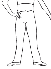 Первая позиция: пятки вместе, носки врозь. Стопы расположены на одной прямой линии.