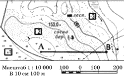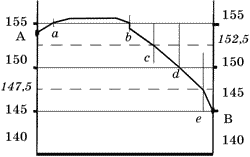 Начинаем от точки А. Первая горизонталь, которую пересекает линия А—В, это горизонталь 155 м. Она находится на расстоянии 0,3 см от точки А (на рис. обозначена буквой а). Поскольку горизонтальный масштаб профиля в два раза больше масштаба карты, то на профиле это расстояние будет тоже в два раза больше 0,3 см х 2 = 0,6 см. Первая точка нашего профиля находится на высоте 155 и на расстоянии 6 мм от точки А. Соединяем точку А с точкой. Далее линия А—В снова пересекает горизонталь 155 (точка b). Это на расстоянии 3,2 см от точки А (или можно определить расстояние от предыдущей точки пересечения – 2,9 см). Значит, следующая точка профиля снова на высоте 155 и на расстоянии 3,2 см х 2 = 6,4 см от точки А. Обозначаем ее. У нас две точки с высотой 155. Их можно соединить прямой линией, но по карте мы видим, что между этими точками высокая часть холма. Значит, лучше показать, что здесь рельеф повышается, и провести небольшую дугу. Но не показывать это повышение выше 2 мм от линии 155 (т. к. самая высокая точка холма – 156 м, т. е. всего на 1 м выше нашей горизонтали, а в вертикальном масштабе профиля 1 м = 0,2 мм). По карте видно, что на горизонтали 155 м в месте пересечения b обозначен обрыв (эти условные знаки нужно знать). Его нужно обязательно обозначить на профиле. Его глубина на карте не показана, но явно меньше 2,5 м – высоты сечения рельефа. Поэтому высоту выбираем произвольно, соизмеряясь с масштабом карты. Следующая горизонталь, которую пересекает линия А—В, – 152,5 м. Точка пересечения (на рис. обозначена с) находится на расстояния 0,7 мм от точки b, на профиле это будет 1,4 см. Обозначаем точку, рисуем понижение рельефа. Следующая горизонталь 150 м пересекает линию А—В в точке d. Она расположена на расстоянии 1,1 см от точки с, т. е. на профиле обозначаем ее через 2,2 см. Точка е имеет высоту на 2,5 м ниже 150–147,5. Она расположена на расстоянии 0,5 см от точки d, на профиле это 1 см. Соединяем все точки. Ответ: