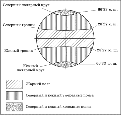 По тропикам и полярным кругам на Земле выделяют пояса освещения, которые образовались в результате годового обращения Земли вокруг Солнца при постоянном наклоне земной оси к плоскости орбиты. Всего таких поясов пять: жаркий, два умеренных и два холодных. Границами поясов являются тропики и полярные круги (рис. 9)