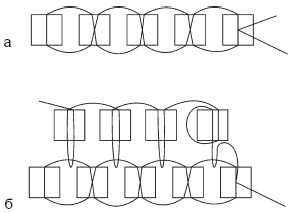 Кирпичный стежок: а) начальный ряд; б) второй ряд