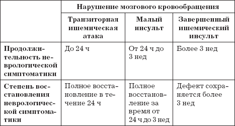 В зависимости от продолжительности неврологической симптоматики выделяют следующие клинические формы острых ишемических нарушений мозгового кровообращения (см. табл. на с. 24):