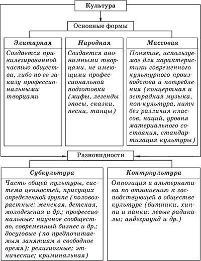 Однако чаще всего, говоря о многообразии культур, подразумевают три формы культуры: элитарную, народную, массовую и две ее разновидности: субкультуру (от лат. sub – под) и контркультуру (от лат. contra – против).