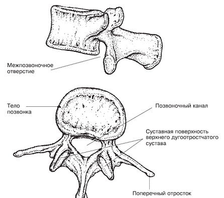 Каждый позвонок состоит из круглого или почкообразного тела и дуги, замыкающей позвоночное отверстие. От нее отходят суставные отростки, служащие для сочленения с выше– и нижележащими позвонками (рис. 1.2).