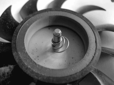 Определились с типом смазки? Нанесите ее на вал крыльчатки (рис. 2.7) и вставьте ее на свое место. После этого несколько раз прокрутите крыльчатку вокруг своей оси, чтобы смазка распределилась равномерно. В результате немного смазки может выйти со стороны крепления крыльчатки, и ее нужно вытереть. Затем установите крепежную шайбу и приклейте наклейку.