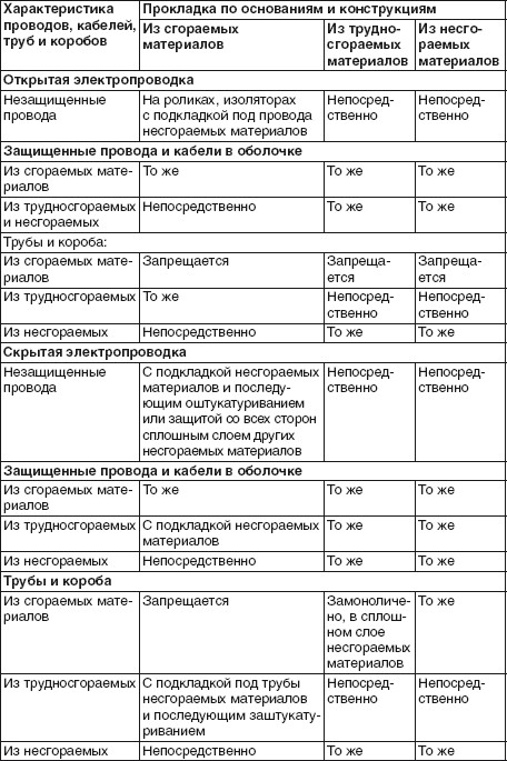 Таблица 1.4. Выбор электропроводок по условиям пожарной безопасности