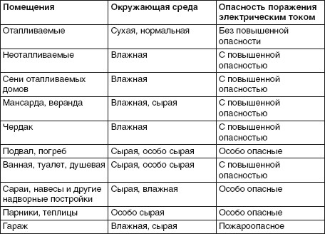 Ознакомившись с табл. 1.2–1.4, приведенными ниже, вы сможете охарактеризовать свои помещения по степени опасности поражения электрическим током, а также выбрать вид и способ прокладки электропроводки в соответствии с вашими условиями пожарной безопасности.