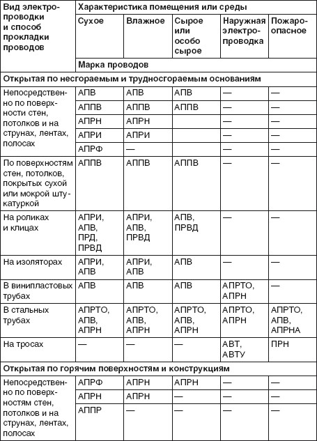 Таблица 1.3. Виды электропроводки и способы прокладки проводов
