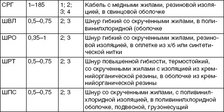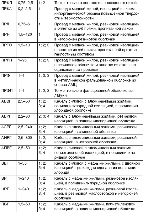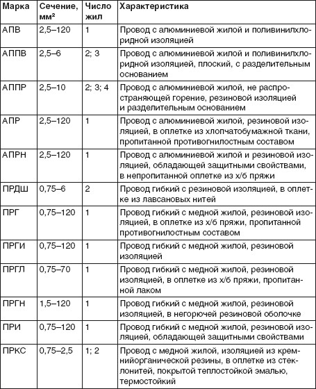 Таблица 1.11. Характеристики различных марок проводов и кабелей