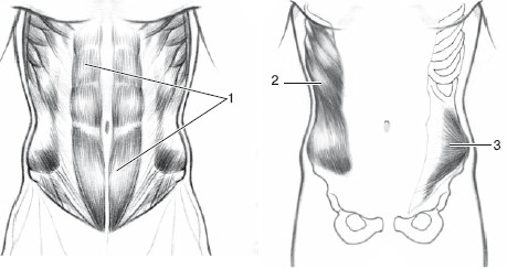 Помимо прямой мышцы (1), в составе брюшного пресса выделяют внешние (2) и внутренние (3) косые мышцы живота.