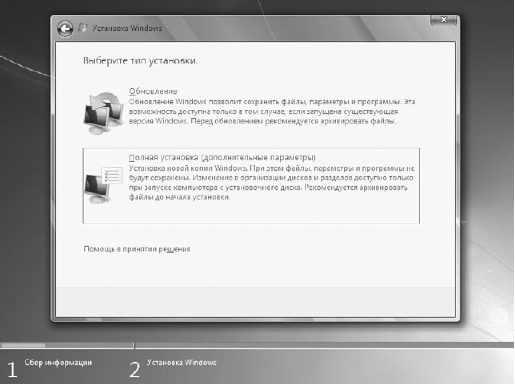 Теперь можно расслабиться на достаточно длительное время и лишь наблюдать за сменой этапов процесса установки (рис. 4.8). Как и в Windows Vista, установка Windows 7 состоит из пяти этапов, каждый из которых выполняет определенные действия, например копирует или распаковывает файлы, устанавливает компоненты и т. д. Все это занимает достаточно много времени, в процессе которого на экране меняется показатель процесса выполнения каждого из этапов в процентном соотношении, а также зеленая строка индикатора в нижней части экрана. Кстати, именно эта строка и отображает текущий процент выполнения полной установки операционной системы, поэтому приблизительно можно ориентироваться, сколько еще осталось до окончания процесса.