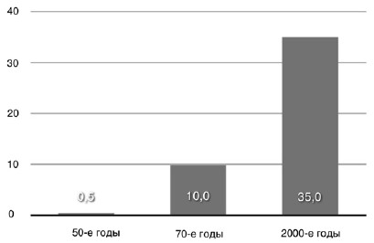 Точные данные по России, к сожалению, отсутствуют, однако состояние и серьезность перспектив проблемы можно оценить на примере США, где борьбе с так называемыми преступлениями против бизнеса (crime against business) уделяется значительное внимание. По экспертным оценкам, проведенным в США в конце 50-х годов прошлого века, кражи, совершаемые работающим персоналом, обходились американскому бизнесу в сумму чуть более полумиллиарда долларов в год. К концу 70-х годов убытки от различного рода преступлений против бизнеса возросли уже до 10 млрд долларов в год, а в начале нового тысячелетия – с учетом непрямых расходов (стоимость страхования, превентивные меры, совершенствование систем безопасности и т. д.) – ущерб от внутрикорпоративных преступлений достигал уже размера 30–40 млрд долларов ежегодно (см. диаграмму 2).