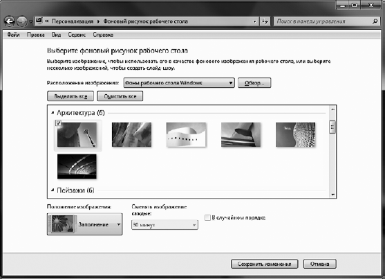 В Windows 7 появилась целая галерея красивых изображений (рис. 2.12), которыми вы можете украсить Рабочий стол. Чтобы открыть ее, щелкните на ссылке Фон рабочего стола в окне Персонализация.