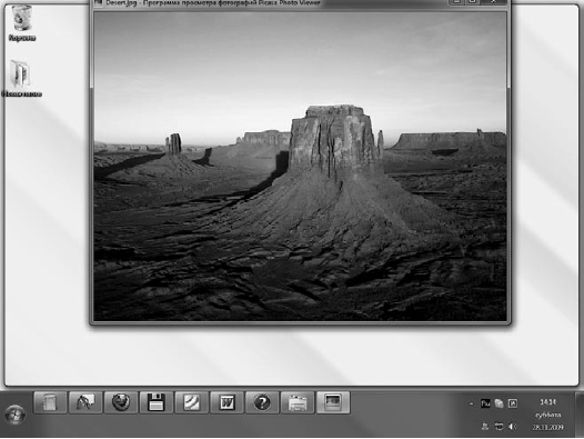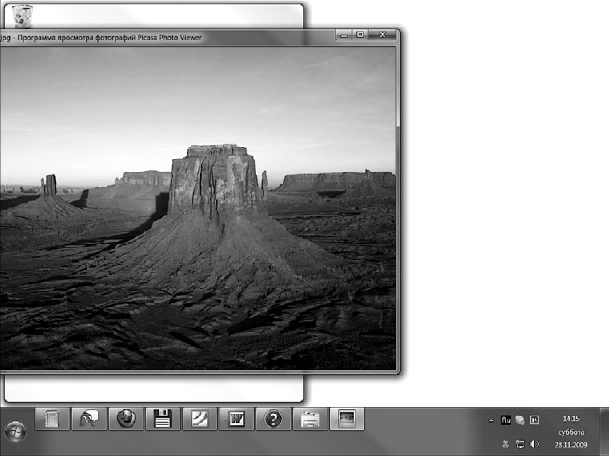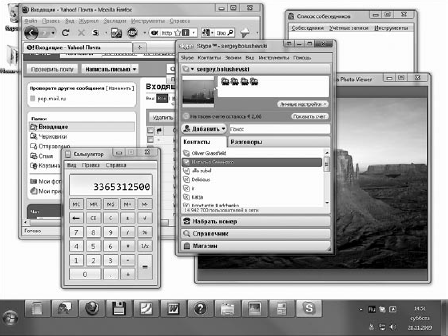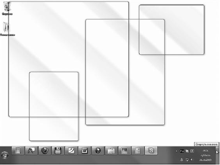 • «Взгляд» Aero. Кнопка Свернуть все окна в Windows 7 перемещена в противоположный привычному конец Панели задач. При этом возможности этой кнопки расширились. Попробуйте подвести указатель мыши к кнопке Свернуть все окна – все открытые окна станут прозрачными, останутся только их контуры и будет виден Рабочий стол (рис. 2.9). Такой Aero-«взгляд» поможет вам быстро увидеть Рабочий стол. Уберите указатель мыши с кнопки Свернуть все окна – все вернется на прежнее место.
