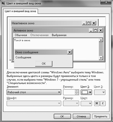 Windows 7 позволяет отключить стиль Windows Aero и перейти к упрощенному стилю Windows 7. Это актуально тогда, когда при выборе стиля Windows Aero ресурсов компьютера недостаточно для хорошей производительности. Чтобы сменить стиль, щелкните на ссылке Дополнительные параметры оформления. В результате откроется окно Цвет и внешний вид окна, аналогичное тому, которое присутствовало в предыдущих версиях Windows (рис. 2.13).