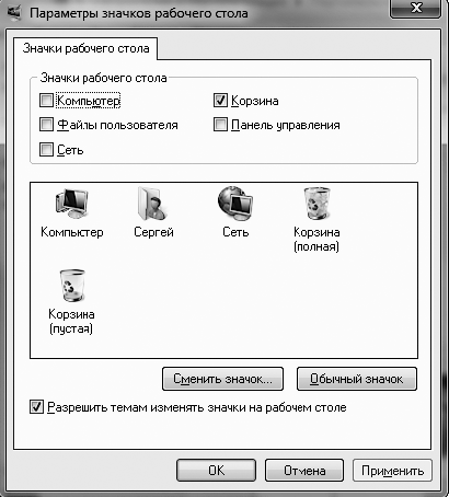 Как уже говорилось в начале главы, после установки Windows на Рабочем столе имеется всего один значок – Корзина. Доступ к системным папкам можно получить только с помощью меню Пуск. Однако вы можете поместить на Рабочий стол значки важнейших системных папок. Для этого щелкните на ссылке Изменение значков рабочего стола в окне Персонализация и в открывшемся окне (рис. 2.15) отметьте флажками названия тех папок, которые желаете видеть на Рабочем столе.