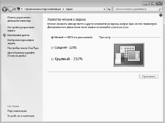 Если экранные шрифты кажутся вам слишком мелкими, можете увеличить их размер. Для этого в окне Разрешение экрана пройдите по ссылке Сделать текст и другие элементы больше или меньше (рис. 2.18).