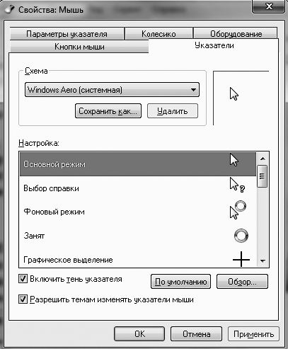 Еще одной отличительной особенностью интерфейса Windows 7 стал набор указателей мыши изящных видов. Как и в предыдущих версиях Windows, есть возможность изменять вид указателя мыши в различных ситуациях. Щелкните на ссылке Изменение указателей мыши в окне Персонализация. В открывшемся окне вы увидите примеры указателей для выбранной схемы (рис. 2.16).