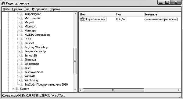 Запустите редактор реестра. В левом окне программы раскройте раздел HKEYCURRENTUSER. Далее найдите в нем подраздел Software и щелкните на нем правой кнопкой мыши для вызова контекстного меню. Выберите в меню команды Создать ► Раздел. По умолчанию будет создан раздел Новый раздел #1. Сразу присвойте ему новое имя. Напечатайте новое имя для раздела, например Test, и нажмите Enter (рис. 1.9). Если вы случайно переключились на другое окно и имя созданного раздела стало недоступным для редактирования, то не пугайтесь. Щелкните для выделения созданный раздел Новый раздел #1 и в контекстном меню выберите пункт Переименовать (или нажмите клавишу F2). Имя раздела станет доступно для редактирования, и вы сможете его задать.