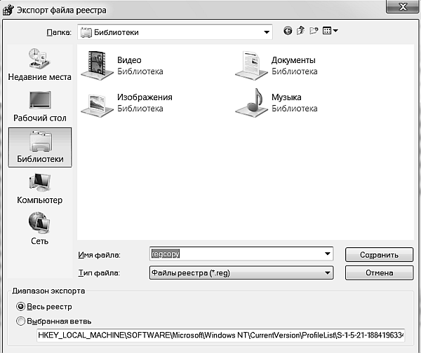 Для того чтобы экспортировать только выбранный раздел реестра, достаточно щелкнуть по нему правой кнопкой мыши и выбрать из контекстного меню команду Экспортировать. Появится уже знакомое нам диалоговое окно, в котором переключатель автоматически будет стоять в позиции Выбранная ветвь и в текстовом поле будет указан полный путь к разделу.
