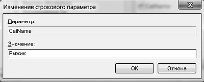 Дважды щелкните мышкой на созданном параметре (или вызовите контекстное меню и выберите команду Изменить). У вас появится диалоговое окно, в котором вы можете присвоить новое значение для параметра. Введите какое-нибудь слово, например Рыжик, и нажмите клавишу Enter (рис. 1.11).