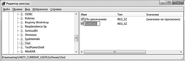 Выделите раздел мышкой и нажмите правой клавишей для вызова контекстного меню. Выберите последовательно команды Создать ► Строковый параметр. У вас появится новый параметр Новый параметр #1, готовый к редактированию. Введите вместо имени, предлагаемого по умолчанию, новое имя, например CatName (рис. 1.10), и нажмите клавишу Enter. Вы только что создали новый параметр, у которого еще нет значения.