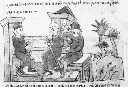 Совет князя Владимира с боярами и старцами о выборе веры. Миниатюра Радзивилловской летописи