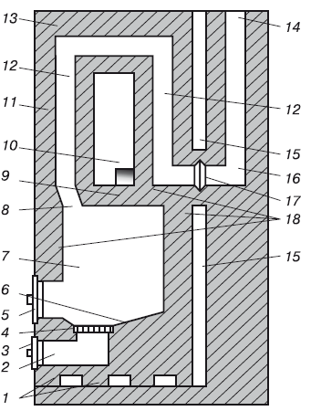 3 – поддувальная дверца; 4 – колосниковая решетка; 5 – топочная дверца; 6 – под (имеет скат к решетке); 7 – топочная камера; 8 – хайло, или прогар; 9 – свод топки; 10 – камера (виден душник); 11 – наружная стенка; 12 – дымооборот; 13 – перекрыша печи; 14 – дымоход (к трубе); 15 – отступка (зазор между дымоходом и печью); 16 – канал; 17 – дымовая задвижка; 18 – внутренние тепловоспринимающие стенки