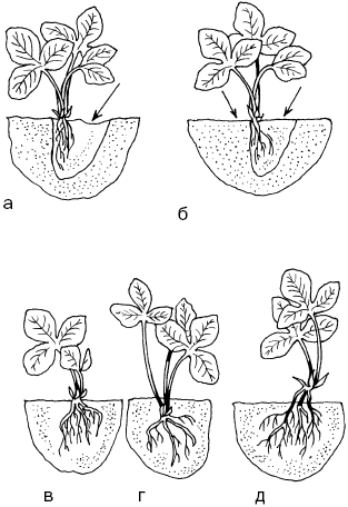 Рис. 3. Процесс посадки кустиков клубники: а – распределение корней в лунке и присыпание их землей; б – уплотнение почвы вокруг корней; в – правильная посадка; г, д – неправильная посадка