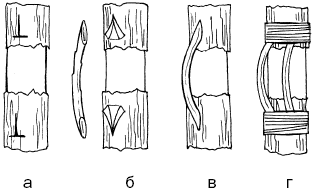 Рис. 4. Прививка «мостиком»: а – подготовка дерева к прививке; б – отгибание коры; в – прививка; г – обвязка
