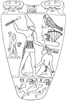 Мы знаем о завоевании и о царе-завоевателе из ряда резных каменных объектов, датирующихся концом додинастического периода: наверший жезлов, рукояток ножей, сланцевых пластин (палетки). Самый полезный из них объект – это палетка Нармера в Каирском музее. Каменные пластинки часто встречаются в додинастических могилах; ими пользовались для растирания косметики. Со временем они становились больше, и их поверхность сделалась основой для рельефов. Палетка Нармера показывает нам причудливого маленького царя в короткой юбке и в белой короне Юга. Царь хладнокровно готовится трахнуть коленопреклоненного пленника булавой по голове. Над пленником любопытный символ, показывающий сокола (означающего царя) над побежденной Дельтой. Позади хищной фигуры царя – крошечная фигурка его сандаленосца (размеры фигур на египетских рельефах указывали на относительную важность, а не на реальные измерения). Наверху, между двумя головами богини Хатор, помещены знаки царского имени – Нармер. На оборотной стороне палетки Нармер, все еще со своим верным сандаленосцем, показан в красной короне Севера.