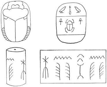 Почему мы не считаем эти вещи египетскими? Потому что все они (а кроме тех, которые мы упомянули, есть и другие) в Египте быстро исчезают и заменяются вещами, изготовленными уже по-египетски. В каменной архитектуре начинают применять монолитные блоки, которые можно видеть в пирамидах Гизы, цилиндрические печати сменяются штампами в форме скарабеев. И разумеется, письменность совсем не похожа. Предметы, рисунки которых стали основой иероглифической письменности, – это египетские предметы.