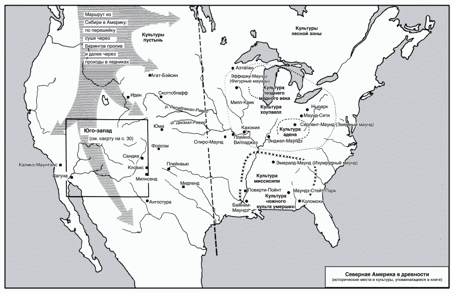 Кловис – фолсом – плано; именно в такой последовательности располагаются культуры периода, который называют палеоиндейским (то есть раннеиндейским, «на заре жизни индейцев») или литическим (то есть периодом использования каменных орудий; от греческого «литос» – камень). Этот период был очень длительным по времени: он начался где-то 50 000 лет назад и закончился примерно в 8000–7000 гг. до н. э. Хотя наконечники, типичные для всех трех культур, были обнаружены по всей территории Северной Америки, образцы, найденные в Центральной и Южной Америке, несколько отличались от североамериканских; при этом следует отметить, что охотники из Северной Америки продвигались на юг со скоростью примерно 1–2 км в год. В любом случае, как было установлено, культуры литического периода достигли южной оконечности Аргентины примерно к 8000 г. до н. э.[11]