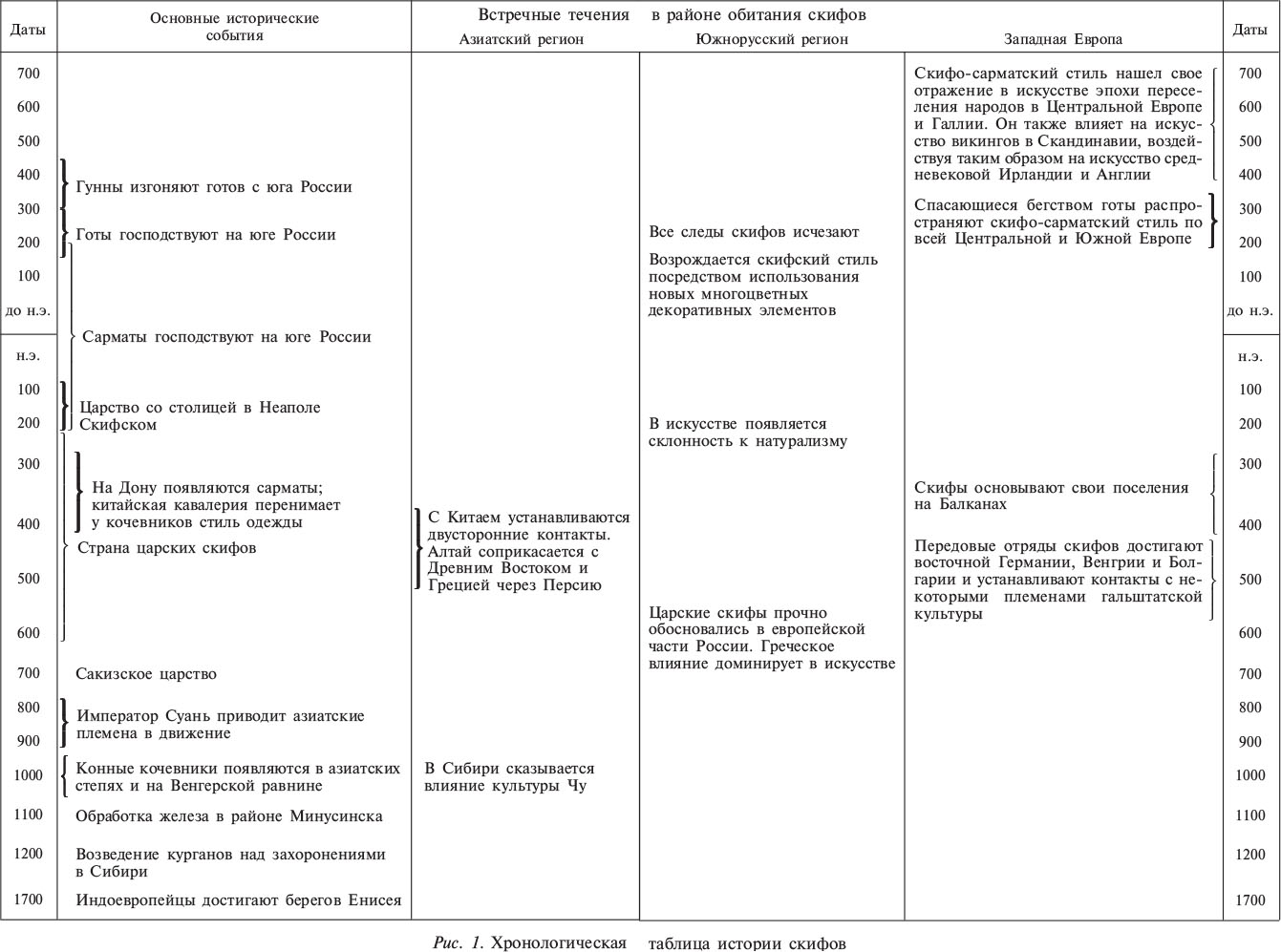 На всей этой территории, которая нас интересует, скифы и родственные скифам племена были в основном кочевниками, но их пастушеская жизнь зависела в определенной степени и от земледельческих общин. И совсем не представляется невероятным то, что по крайней мере к V в. до н. э. какая-то часть каждого племени жила в постоянных или полупостоянных поселениях, которые служили базой для кочевой части племени. Оказалось, что у кочевников европейской и азиатской частей равнины выработался очень схожий режим жизни и развились схожие занятия. И в результате этого не наблюдается сильно выраженных различий во вкусах и интересах, в одежде и вооружении этих двух групп. Ввиду дальности этих времен невозможно определить, насколько сходство было следствием существования неких расовых связей между этими группами, насколько оно зависело от схожести окружающей среды и образа жизни. Искусство и тех и других, хоть и похожее в своей основе, тем не менее имеет свои отличительные черты благодаря некоторым местным особенностям, отчасти являющимся следствием того географического положения, которое занимала азиатская и европейская части равнины. Евразийская степь, простирающаяся от восточных стран до Центральной Европы, настолько огромна, что неизбежно народы, живущие на той или иной ее окраине, должны были больше сблизиться со своими непосредственными соседями, даже если они оказывались чужаками, нежели со своими сородичами, но живущими далеко. Таким образом, на Востоке в первую очередь Китай часто оказывал на культуру кочевников этого региона заметное влияние; в центральных районах были более очевидны персидские элементы, а на Западе – греческие. И все же, несмотря на эти чужеродные веяния, культура кочевников главенствовала на всем протяжении этого огромного пространства, проявляясь в более грубой форме на Алтае и с большей утонченностью – у царских скифов на юге Руси. И это влияние не происходило исключительно в одном направлении, так как самобытная культура жителей степи, в свою очередь, чувствовалась, пусть и в меньшей степени, и в культуре Востока, и в культуре Запада.